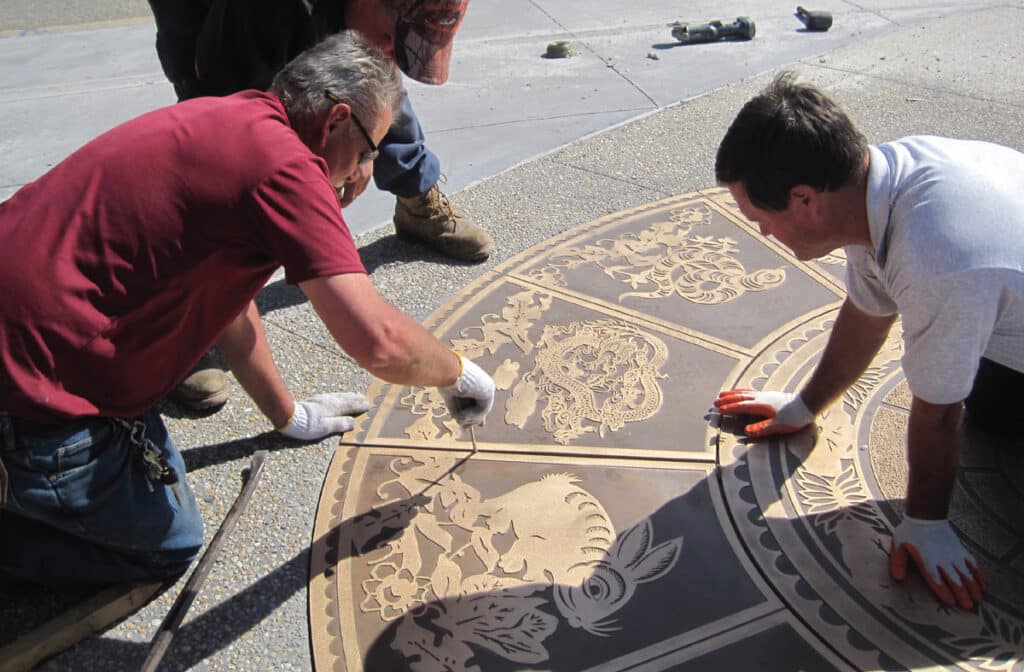 Bronze medallions with Chinese zodiac animal designs are inlaid into the sidewalks.