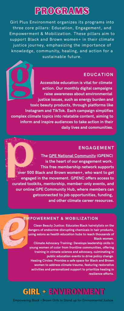 Girl Plus Environment (GPE) is a national 501(c)(3) nonprofit committed to educating, engaging, and empowering Black and Brown women+ to lead climate and environmental justice efforts within their own communities. Founded in 2019 by environmental health activist Diamond Spratling, GPE was born out of the urgent need to center historically excluded voices in the environmental justice movement.