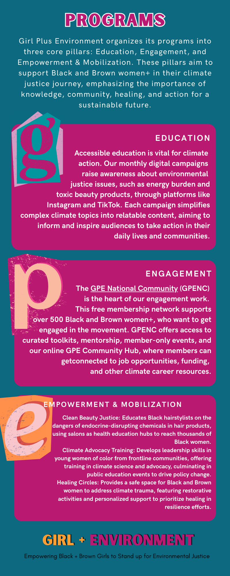 Through a lens that combines environmental justice, health equity, and racial justice, GPE provides accessible, culturally-driven learning experiences and advocacy platforms that mobilize and support those most impacted by environmental harm. By using everyday language, leveraging social media, and producing engaging campaigns, GPE makes climate justice relatable and relevant especially for those traditionally left out of these conversations.